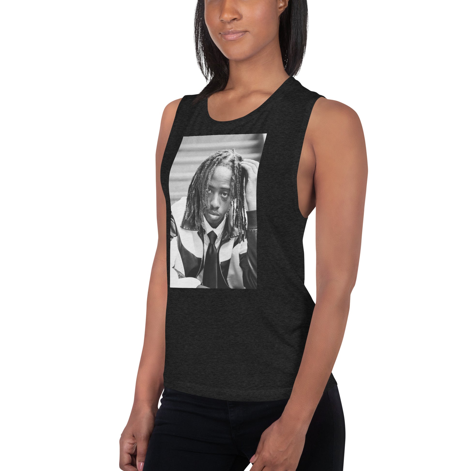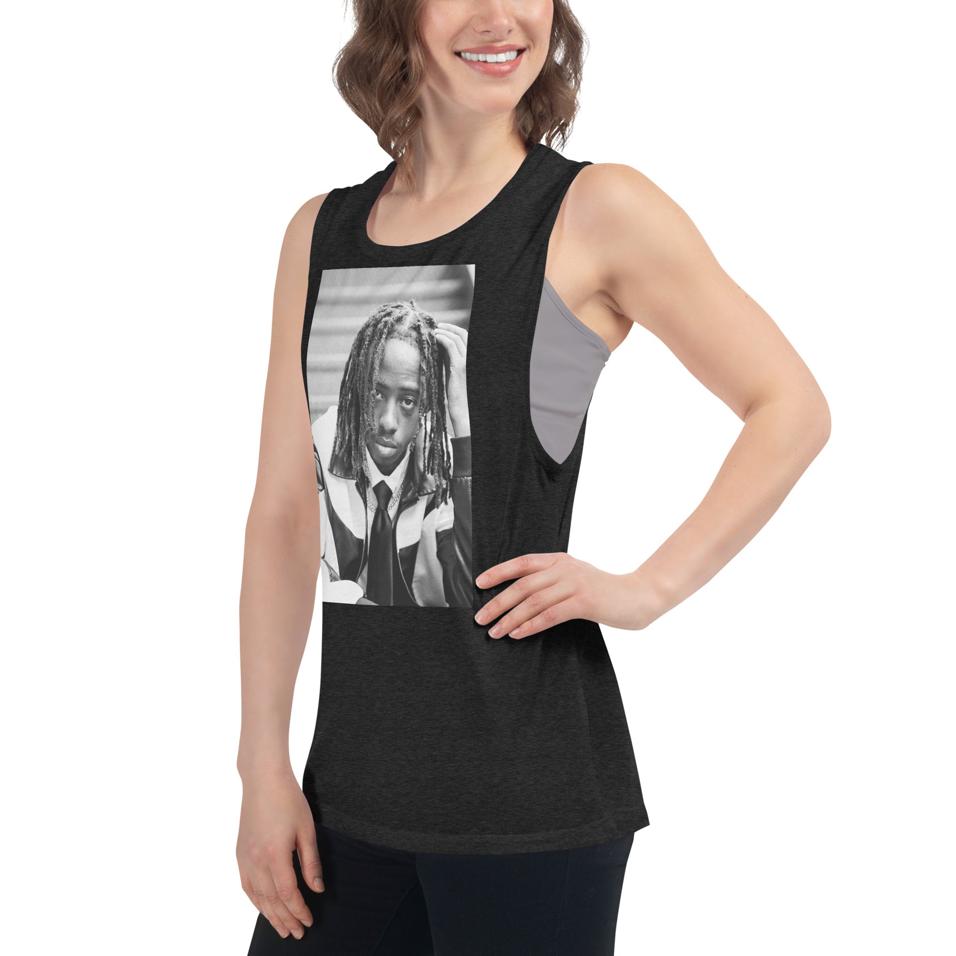 This comfortable muscle tank is soft and flowy with low cut armholes for a relaxed look.